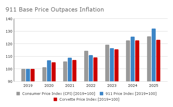 Porsche spent the last half-decade doing what most luxury brands only daydream about: raising prices faster than inflation while mostly climbing on volume. The 911’s base tag sprints from ~$92,350 in 2019 to $122,095 in 2025 (according to Car and Driver), outpacing CPI (BLS) by roughly 6 points, a gold-medal gap in a rate-heavy world.