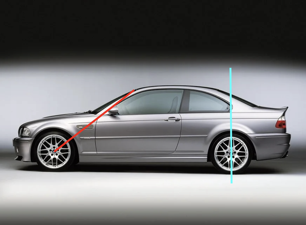 E46 M3: textbook. The A-pillar makes a B-line for the axel giving a long dash-to-axle gives a premium nose; C-pillar kicks off over the rear axle so the coupe’s mass sits inside the wheelbase. Your eye reads “front-mid engine, agile, ready.”