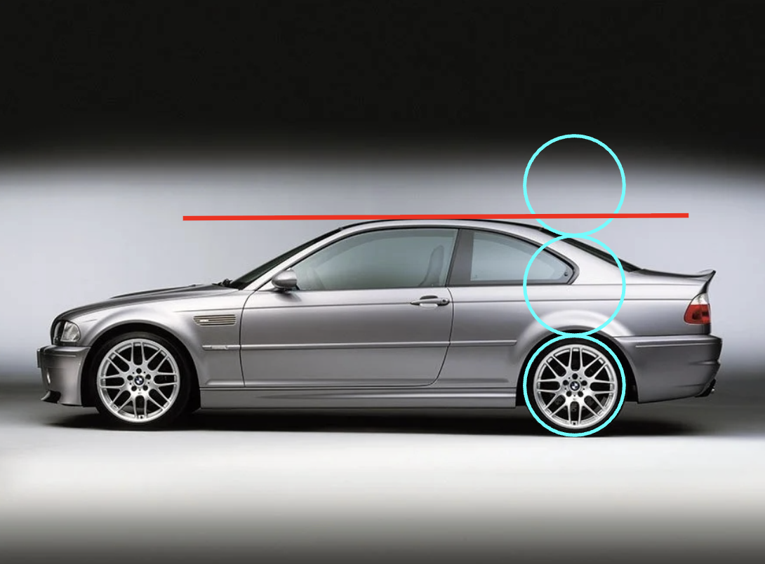 E46 M3: overall height ~1,38 m; typical tire diameter ~0,66 m → ~2.08×