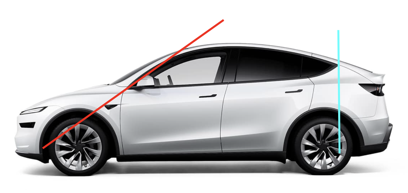 Model Y: modern EV packaging + pedestrian-impact geometry push the A-pillar forward of the axle and the C-pillar behind the rear axle. The cabin overshoots at both ends, so the car looks like it’s wearing its body outside the wheelbase box. That alone makes it feel bloated, even though some raw dimensions are similar.