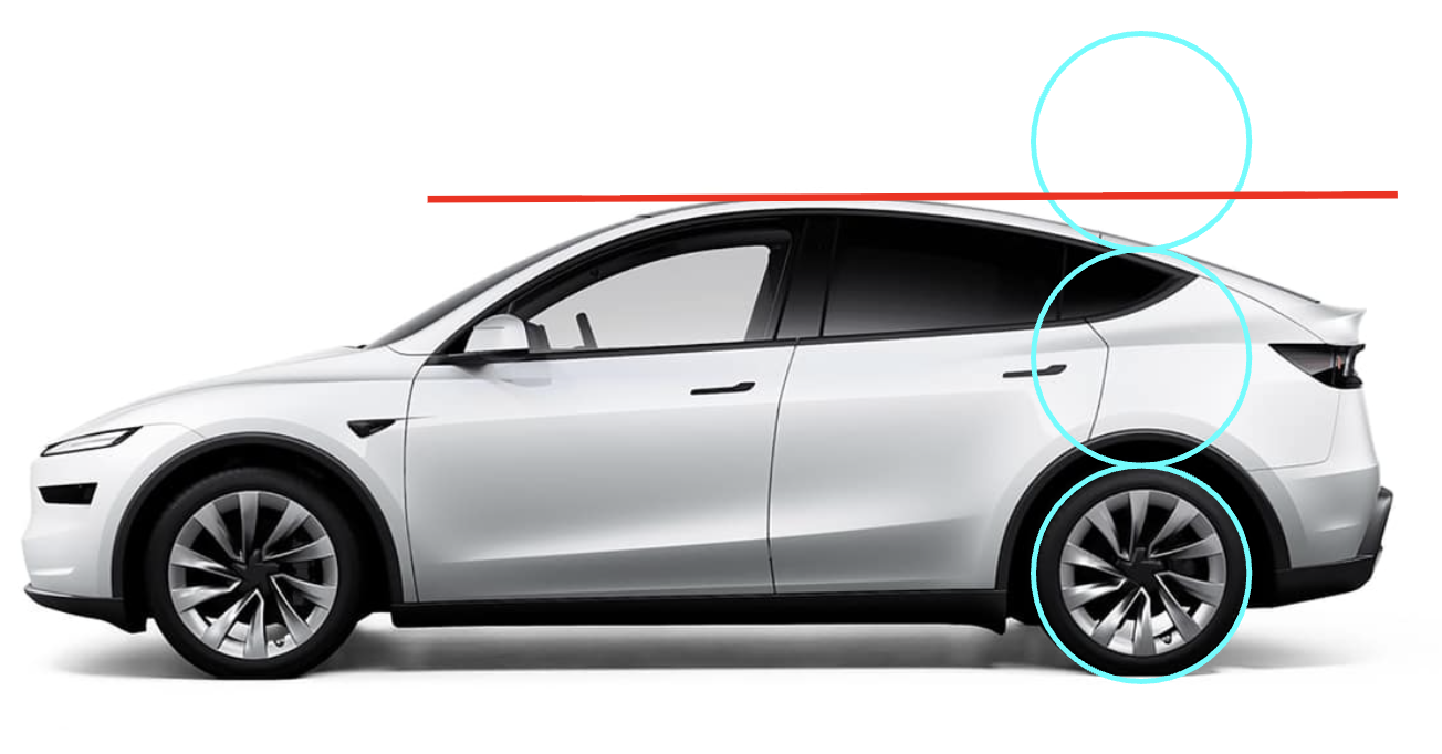 Lower is sportier. Around 2.1x - 2.4x feels planted for coupes/GTs; 2.6x - 3.0x is common in crossovers. The Y isn’t cartoonish, but it’s clearly taller per unit of wheel, so the body reads heavier even before you clock anything else. This is why upsized wheels rarely “fix” a tall crossover: the body is still winning the vertical argument.